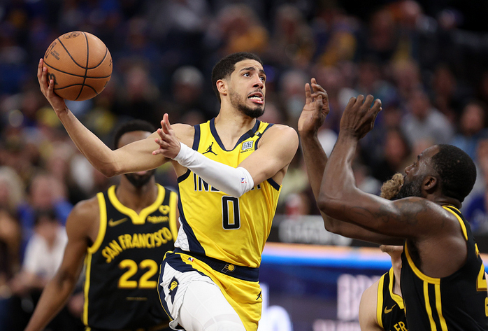 “印第安纳步行者队的泰瑞斯·哈利伯顿对阵金州勇士队。
